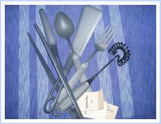 lasta, pieni lasta, haarukka, lusikka, vispilä ja kokkipihdit |